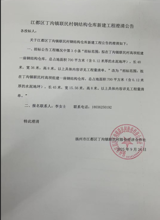 丁沟镇联民村钢结构仓库新建工程澄清公告